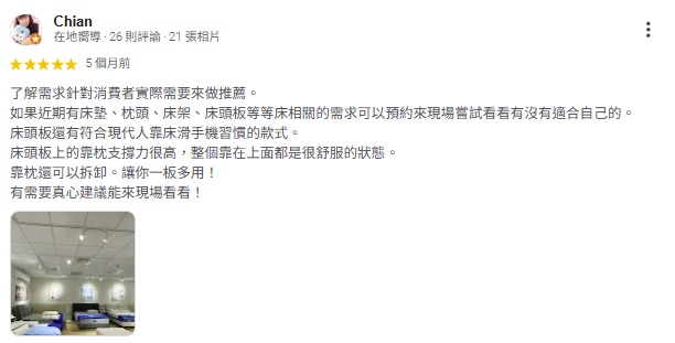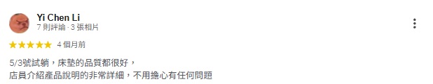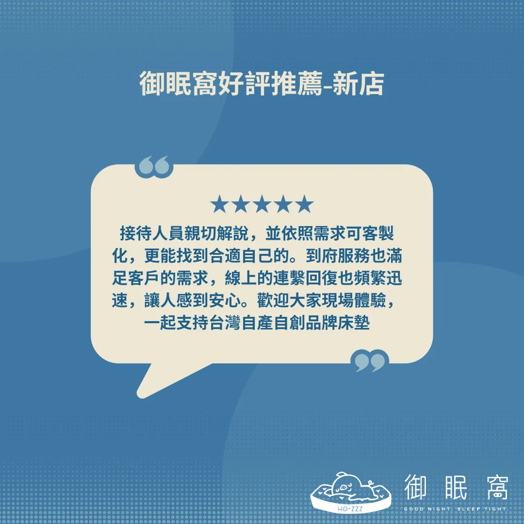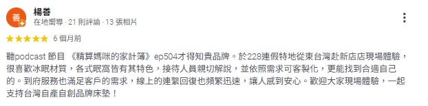 聽podcast 節目 《精算媽咪的家計簿》ep504才得知貴品牌。於228連假特地從東台灣赴新店店現場體驗,很喜歡冰眠材質,各式眠窩皆有其特色,接待人員親切解說,並依照需求可客製化,更能找到合適自己的。到府服務也滿足客戶的需求,線上的連繫回復也頻繁迅速,讓人感到安心。歡迎大家現場體驗,一起支持台灣自產自創品牌床墊!