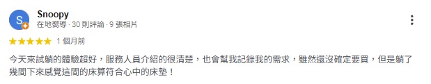 今天來試躺的體驗超好,服務人員介紹的很清楚,也會幫我記錄我的需求,雖然還沒確定要買,但是躺了幾間下來感覺這間的床算符合心中的床墊!