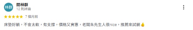 床墊好躺,不會太軟,有支撐,價格又實惠,老闆朱先生人很nice,推薦來試躺👍