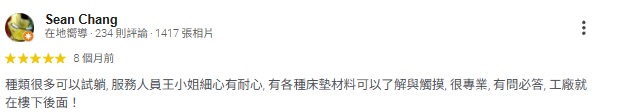 種類很多可以試躺, 服務人員王小姐細心有耐心, 有各種床墊材料可以了解與觸摸, 很專業, 有問必答, 工廠就在樓下後面!