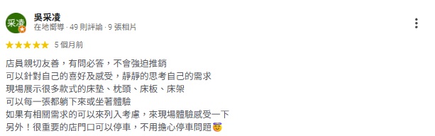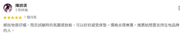 解說地很仔細,而且試躺時的氛圍很放鬆,可以好好感受床墊。價格合理實惠。推薦給想要支持在地品牌的人。