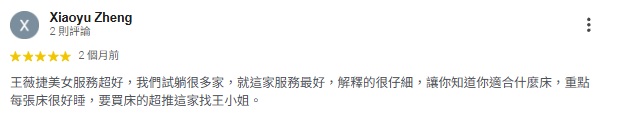 王薇捷美女服務超好,我們試躺很多家,就這家服務最好,解釋的很仔細,讓你知道你適合什麼床,重點每張床很好睡,要買床的超推這家找王小姐。