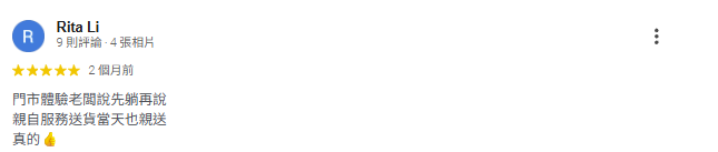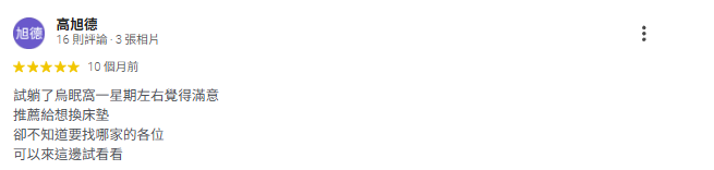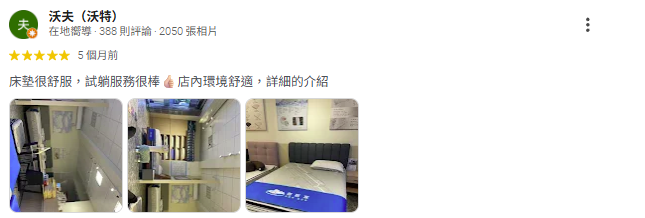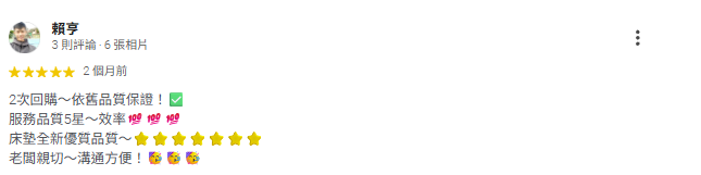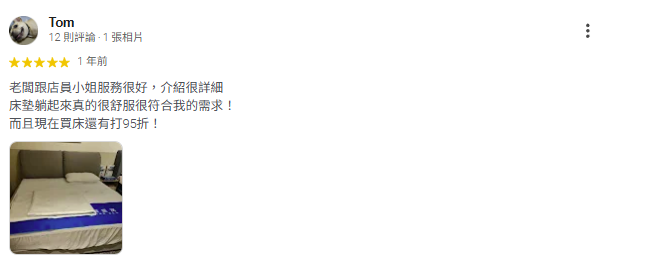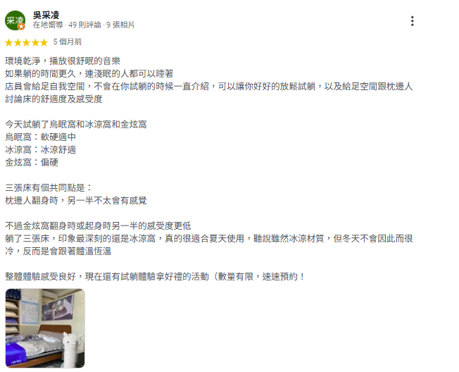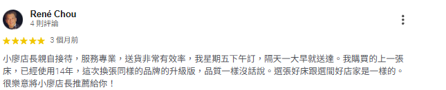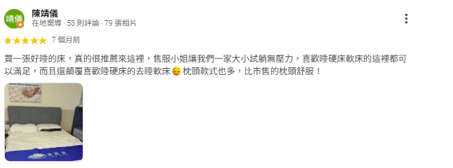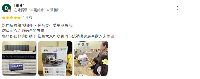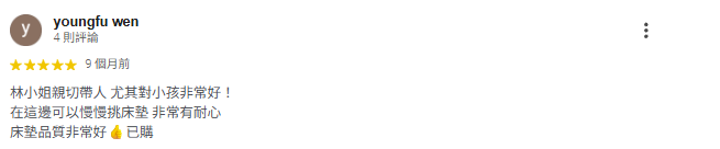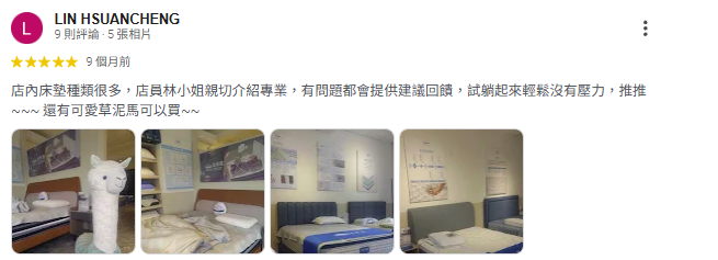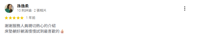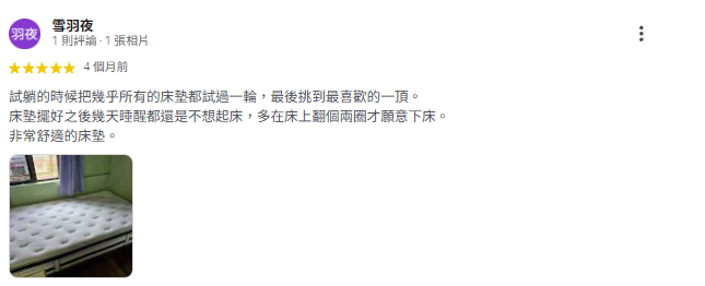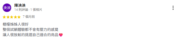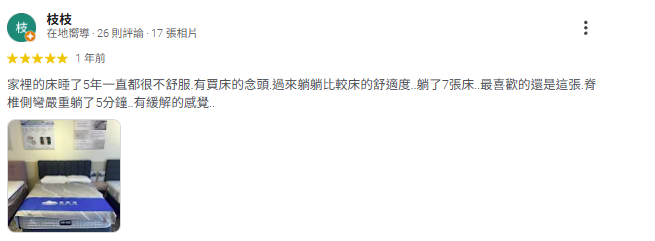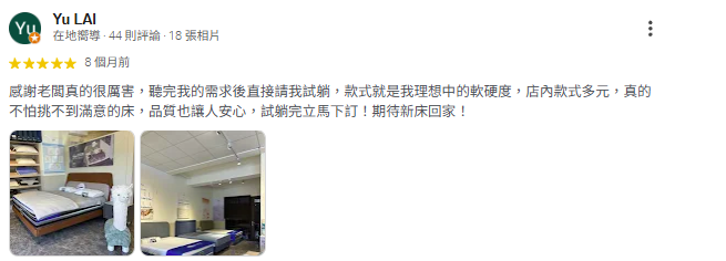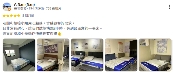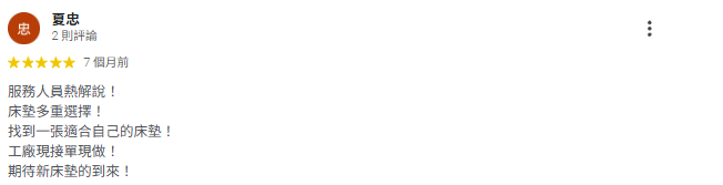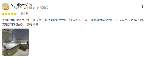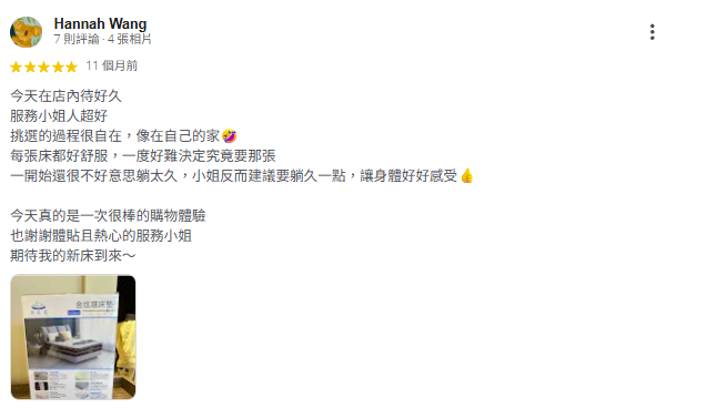 感謝老闆真的很厲害,聽完我的需求後直接請我試躺,款式就是我理想中的軟硬度,店內款式多元,真的不怕挑不到滿意的床,品質也讓人安心,試躺完立馬下訂!期待新床回家!