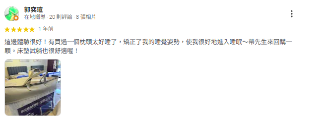這邊體驗很好!有買過一個枕頭太好睡了,矯正了我的睡覺姿勢,使我很好地進入睡眠~帶先生來回購一顆。床墊試躺也很舒適喔!