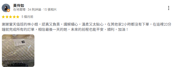 謝謝當天值班的林小姐,認真又負責,講解細心,溫柔又太貼心,在其他家2小時都沒有下單,在這裡20分鐘就完成所有的訂單,相信最後一天的她,未來的前程也能平安、順利,加油!