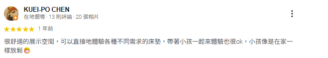 很舒適的展示空間,可以直接地體驗各種不同需求的床墊,帶著小孩一起來體驗也很ok,小孩像是在家一樣放鬆😁