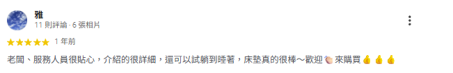 老闆、服務人員很貼心,介紹的很詳細,還可以試躺到睡著,床墊真的很棒~歡迎👏🏻來購買👍👍👍