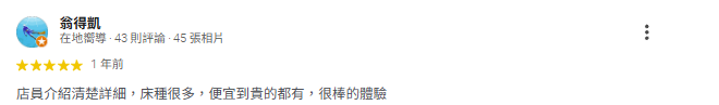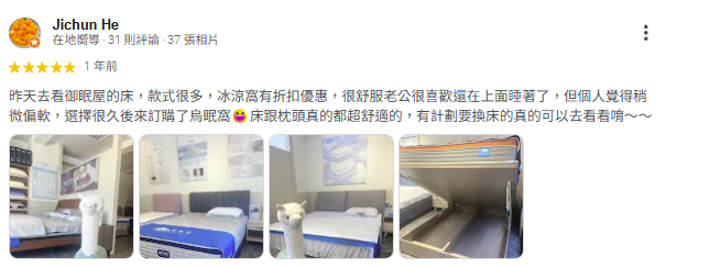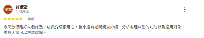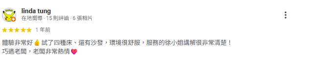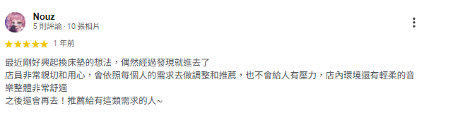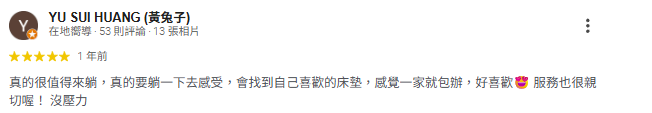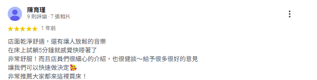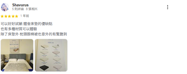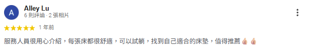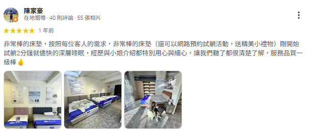 真的很值得來躺,真的要躺一下去感受,會找到自己喜歡的床墊,感覺一家就包辦,好喜歡😍 服務也很親切喔! 沒壓力