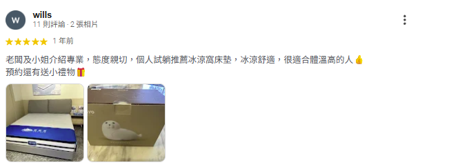 老闆及小姐介紹專業,態度親切,個人試躺推薦冰涼窩床墊,冰涼舒適,很適合體溫高的人👍