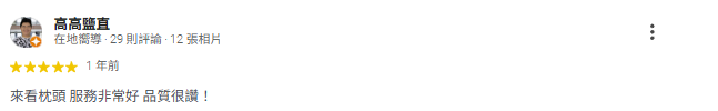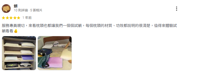 服務專員親切,來看枕頭也都讓我們一個個試躺,每個枕頭的材質、功效都說明的很清楚,值得來體驗試躺看看👍