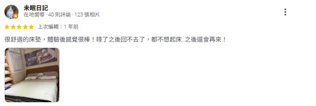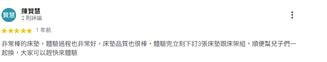 非常棒的床墊,體驗過程也非常好,床墊品質也很棒,體驗完立刻下訂3張床墊跟床架組,順便幫兒子們一起換,大家可以趕快來體驗