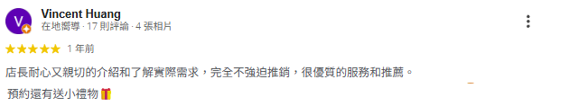 店長耐心又親切的介紹和了解實際需求,完全不強迫推銷,很優質的服務和推薦。