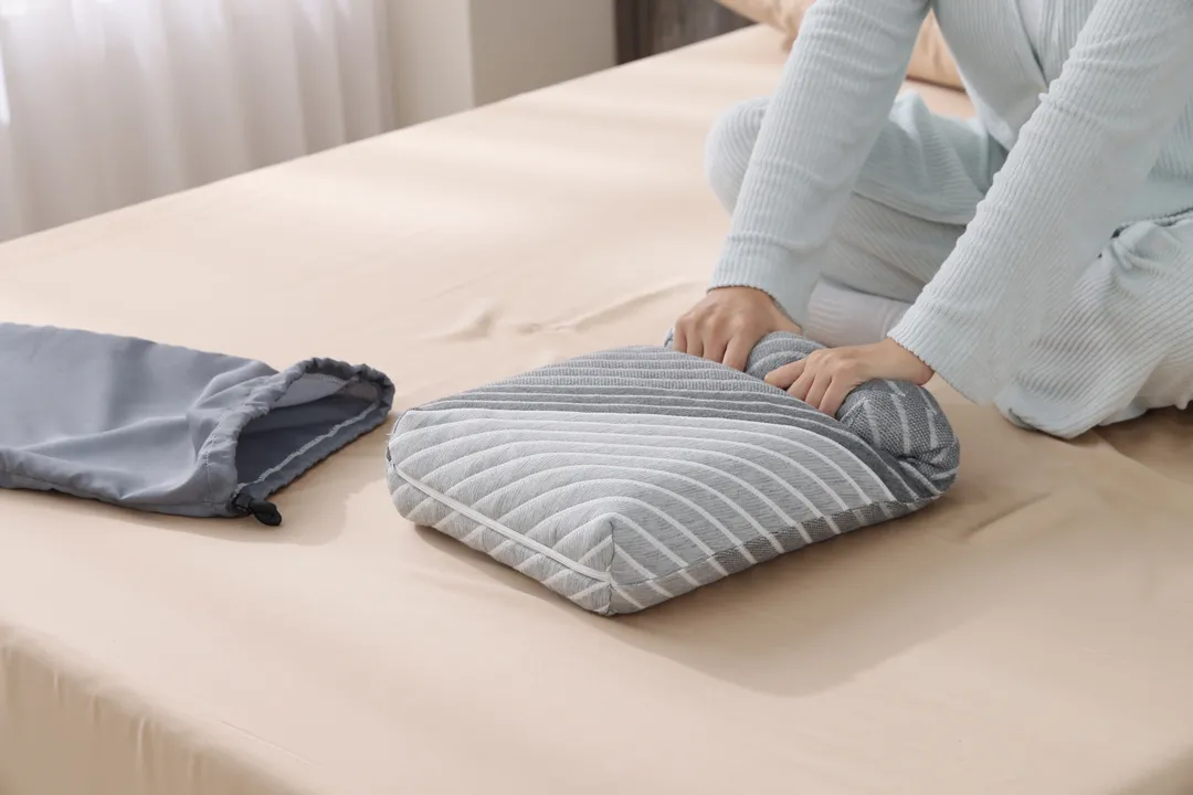 - 將旅行枕完全放入後,拉緊束口並收好束繩,即可輕鬆攜帶與收納。